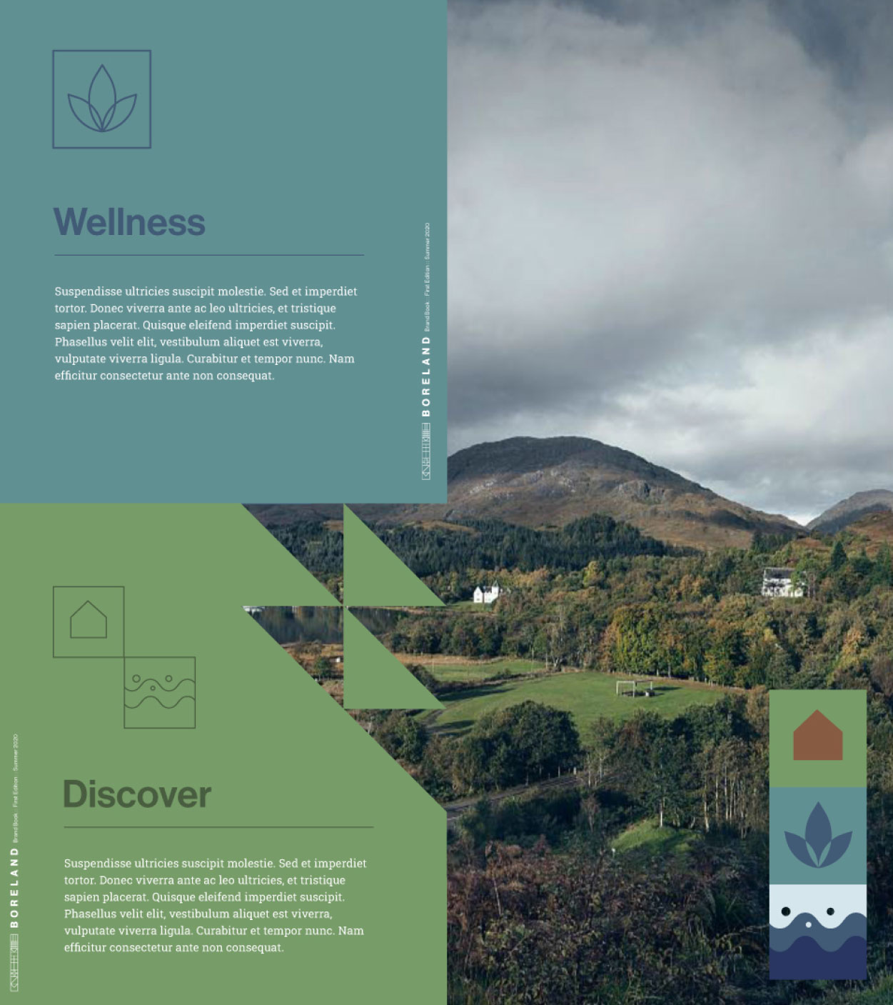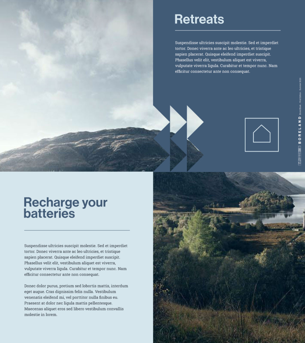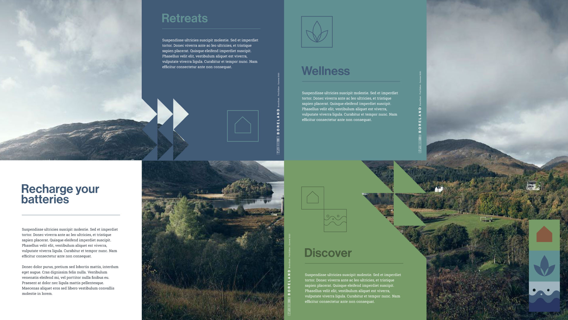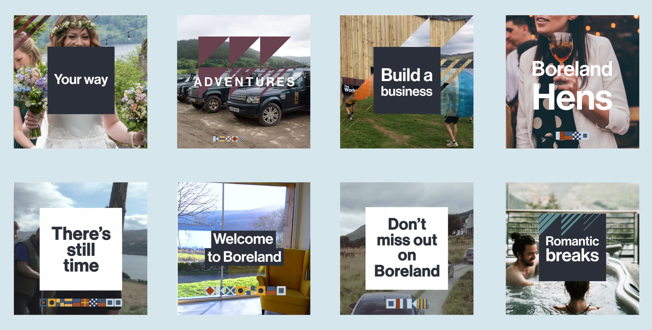 The resulting brand identity is classic, bold and flexible. Using modular components and a versatile colour palette, the visual language brings a consistent frame to all of Boreland’s experiences and activities. Inspired by the notion of guests being taken on a journey of discovery (to relaxation or something more wild) the brand design is reminiscent of trail paths and signage, as well as giving a nod to the Celtic heritage of the team. The alphabet of nautical flags, for instance, spells words, titles and locations, offering an easter egg trail for eagle-eyed viewers to follow.