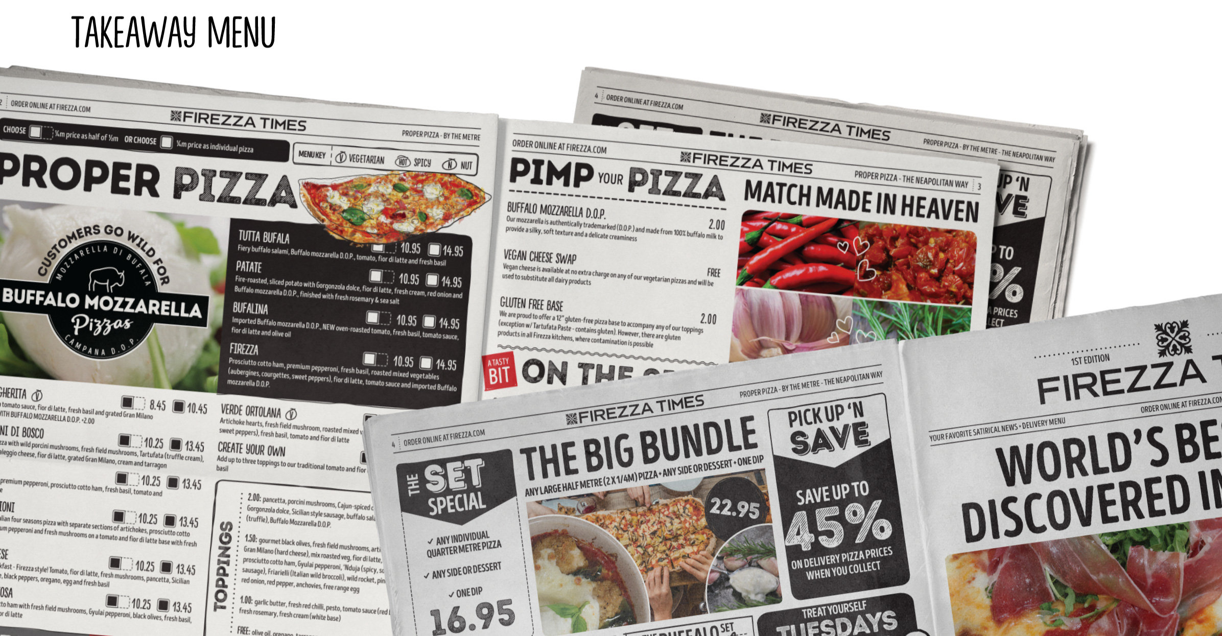 We helped bring Firezza’s eat-in and takeaway restaurants to life, designing their flagship Soho store, and the signage, menus and packaging for all the stores across the country.